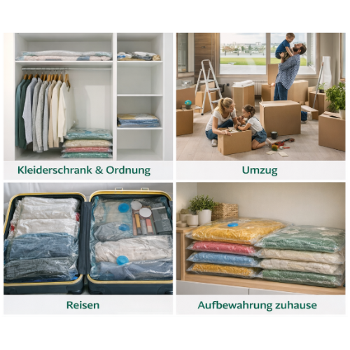 Kleidung kann nach dem Auspacken leicht zerknittert sein das ist normal bei vakuumierter Lagerung. Sehr empfindliche Materialien wie Leder oder spezielle Daunen eignen sich eher für andere Aufbewahrungsarten.